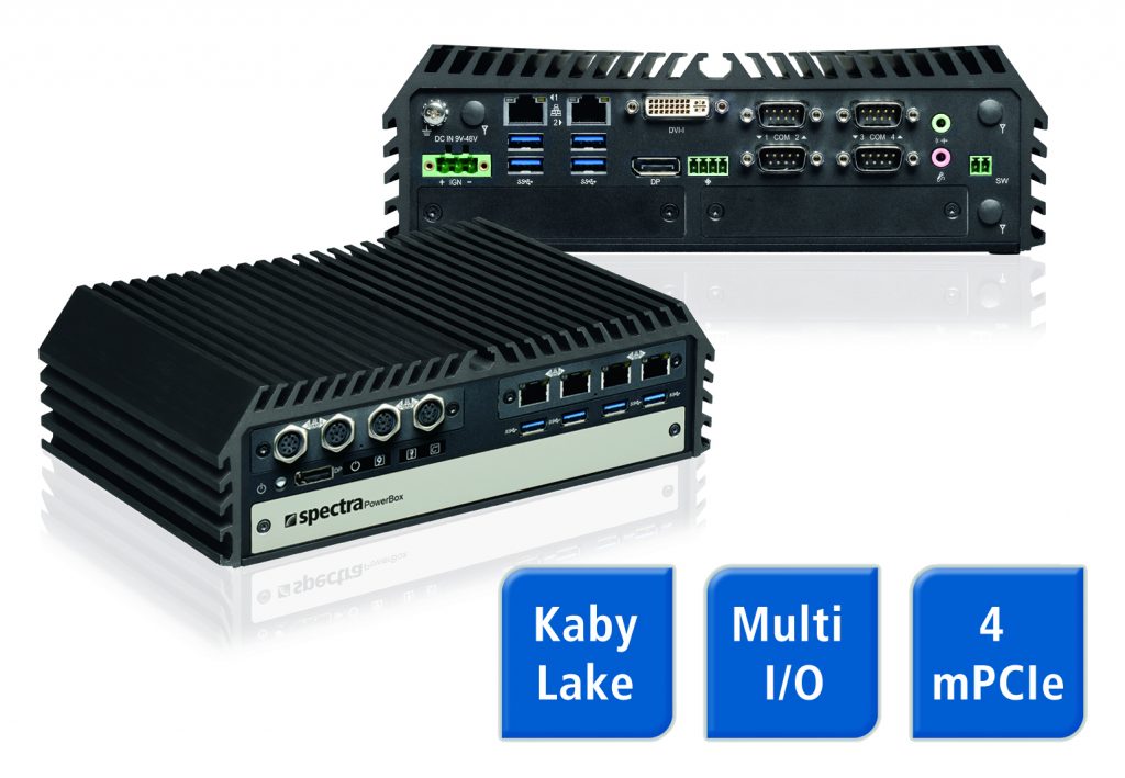 Spectra bringt mit der PowerBox 400 einen lüfterlosen Mini-PC auf den Markt, der eine hohe Leistungsfähigkeit, modulare Erweiterungsmöglichkeiten und kompakte Abmessungen bietet. Für hohe Performance sorgt der integrierte Server-Chipsatz C236 zusammen mit flexibel wählbaren Prozessoren der sechsten und siebten Generation der Intel-Core-Desktop- und -Xeon-Serie. Unterstützt wird die Performance durch zwei DDR4-SO-DIMM-Arbeitsspeicher mit maximal 32GB und zwei Sata-Schnittstellen, die zwei 2,5″-HDD- oder -SSD-Speichermedien aufnehmen. Hohe Flexibilität in der Ausstattung ermöglichen zwei Sockel für LAN- oder PoE-Module, ein Sockel für DIO- oder COM-Module und vier mPCIe-Steckplätze. Die gewählten Einsteckmodule werden einfach eingesteckt und lassen mehr als 100 Varianten zu. Sämtliche Anschlüsse sind bedienerfreundlich an der Front- und Rückseite zusammen mit den Kommunikationsschnittstellen herausgeführt. Anwender können wählen, ob sie einen fertig bestückten und getesteten Mini-PC beziehen oder die Erweiterungsmodule selbst einsetzen wollen. Der lüfterlose Mini-PC bietet Anwendern somit die technischen Möglichkeiten einer 19″-Workstation.
