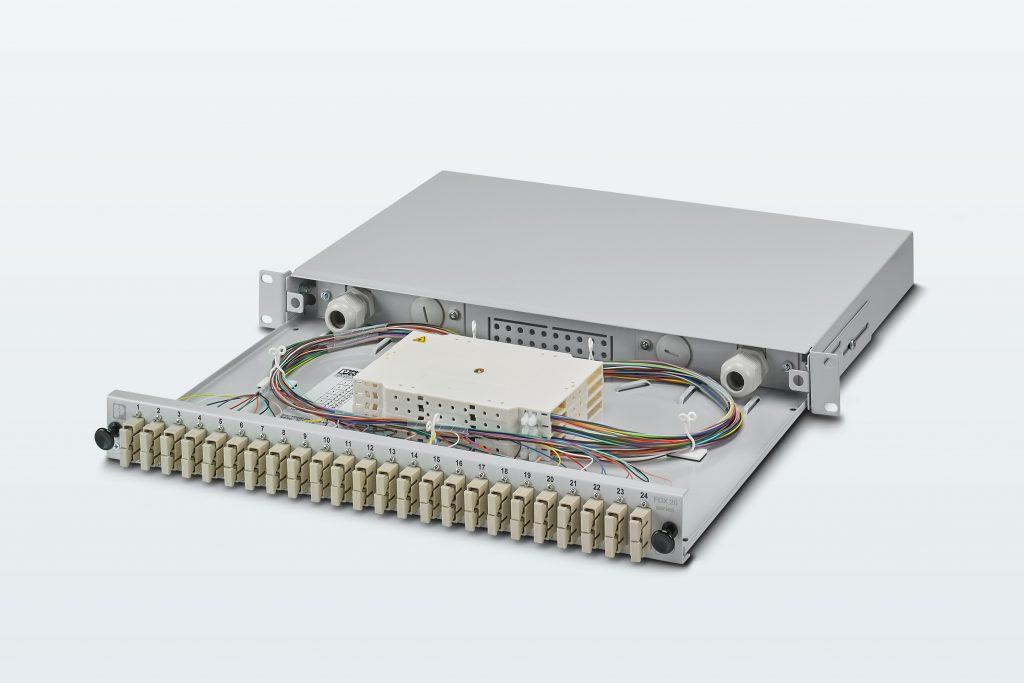 Am weitesten verbreitet sind für diese Anwendung noch immer 19″-Schränke, in denen sowohl die Spleißboxen als auch die aktiven Komponenten übersichtlich und wartungsfreundlich installiert sind. Das 19″-Format bietet für die Spleiß- und Verkabelungsarbeiten ausreichend Platz und erlaubt, die bei LWL-Kabeln vorgegebenen, minimalen Biegeradien einzuhalten (Bild 3). Spleißboxen der Serie FDX 20 von Phoenix Contact haben eine auszieh- und entnehmbare Schublade mit Schnellentriegelung. So kann der Rahmen an der vorgesehenen Position im 19″-Schrank vorinstalliert und die Schublade mit den Pigtails bequem an einem Arbeitstisch gespleißt werden. Pigtails sind die kurzen Lichtwellenleiter-Stücke, die einseitig mit einem LWL-Stecker vorkonfektioniert sind. Da die Schublade tiefenverstellbar ist, lässt sich die Spleißbox zudem an unterschiedliche Schranktiefen anpassen, sodass die angeschlossenen Patchkabel beim Schließen der Tür nicht geknickt oder beschädigt werden. Die in komfortabler Länge ausgeführten, farbigen Pigtails der vorkonfektionierten Spleißboxen sind bereits mit den jeweiligen verschraubten Frontanschlüssen verbunden. Daher müssen lediglich die offenen Faserenden mit den Fasern des Bündeladerkabels verbunden werden. Dies reduziert mögliche Fehlerquellen und reduziert die Inbetriebnahmezeit im Feld. Die beiden vormontierten Kabelverschraubungen bieten durch ihren großzügig dimensionierten Klemmbereich von 7 bis 12mm einer großen Bandbreite von Kabeldurchmessern sicheren Halt (Bild 4).