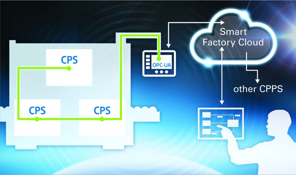 Bild 2: Verschiedene unabhängige Cyber Physical Systems (CPS) sind vertikal zu einem Cyber Physical Production System (CPPS) verbunden, das mit der Smart Factory Cloud kommuniziert. Kontrolliert wird dies durch den Smart Factory Manager. – Bild: Eaton Industries GmbH