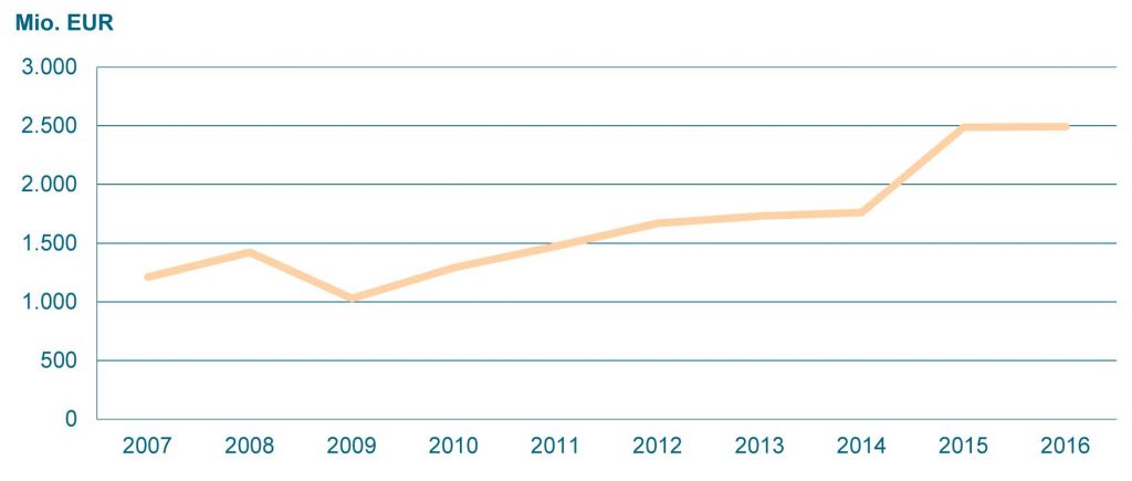 Maschinenlieferanten aus Deutschland konnten an dem seit 2009 spürbaren Aufwärtstrend des verarbeitenden Gewerbes in Mexiko deutlich partizipieren. Leistungsstarke Sektoren sind die mexikanische Nahrungsmittel- und Getränkeindustrie, sowie die Automobilindustrie. Gerade diese exportorientierten Sektoren unterliegen aufgrund des hohen Wettbewerbs sowie der gesetzlichen Vorschriften im Lebensmittelbereich der Notwendigkeit, in moderne Maschinen und Ausrüstungsgüter zu investieren. Lieferanten aus Deutschland können hier die benötigte innovative Spitzentechnologie liefern. Der gesamte Warenexport Mexikos ist mit 373Mrd.US$ (2016) gut doppelt so hoch wie derjenige Brasiliens und unterschreitet den Export Kanadas nur knapp. Die Exportquote gemessen am Bruttoinlandsprodukt Mexikos beträgt knapp 36 Prozent. Zum Vergleich: die Exportquote der USA liegt bei knapp acht Prozent, in Deutschland bei 38,6 Prozent. Der mexikanische Markt für Maschinenbauprodukte hat sich in den vergangenen zehn Jahren etwa verdoppelt. Im Jahr 2016 war Mexiko mit einem Volumen von mehr als 27Mrd.€ der weltweit achtgrößte Markt für Maschinen und Anlagen. Die Größenordnung entsprach dem kanadischen oder südkoreanischen Markt und war nur wenig kleiner als derjenige des Vereinigten Königreiches. Die USA waren mit einem Anteil von knapp 50 Prozent am weltweiten Maschinenexport nach Mexiko der größte Maschinenlieferant des lateinamerikanischen Landes. Deutschland und China waren mit jeweils knapp über neun Prozent Anteil die stärksten Verfolger (Angaben für 2016).