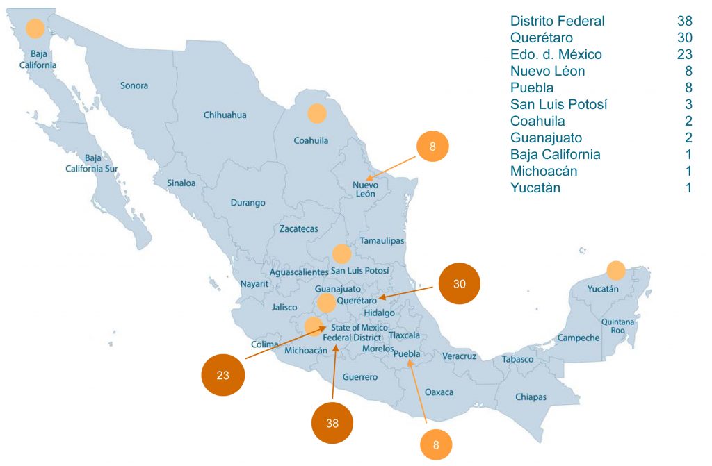 Nach VDMA/AHK-Recherche haben sich 117 Maschinenbauer aus Deutschland in Mexiko angesiedelt mit schätzungsweise 45 weiteren Standorten. – Bild: Recherche AHK Mexico, VDMA e.V.