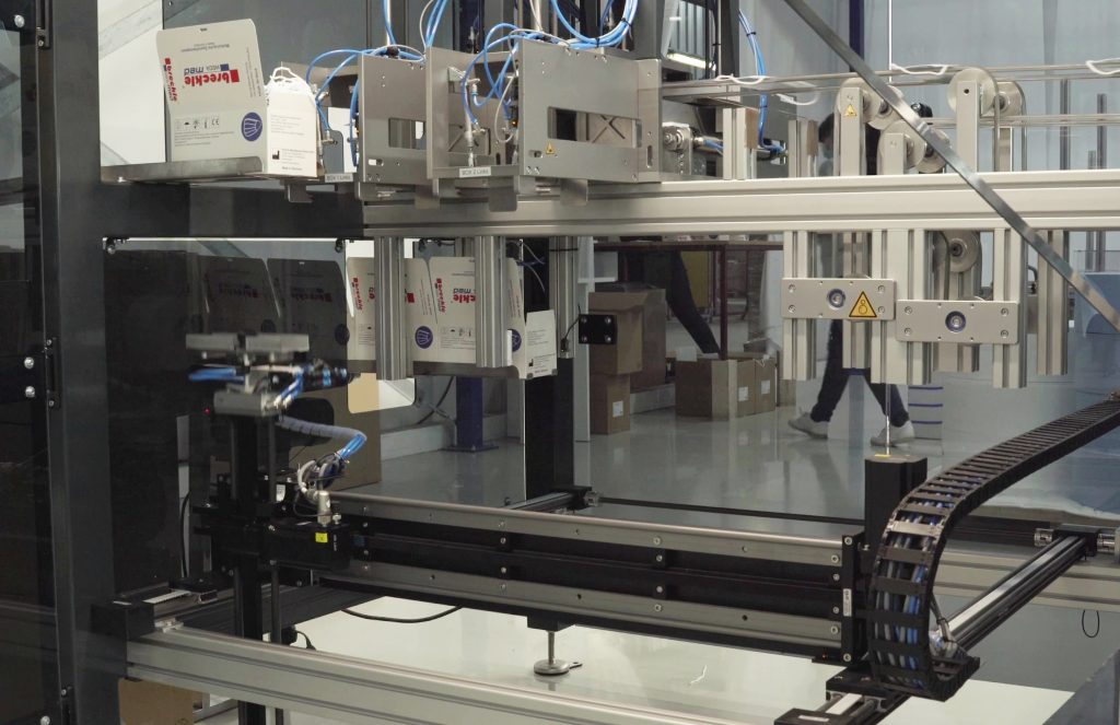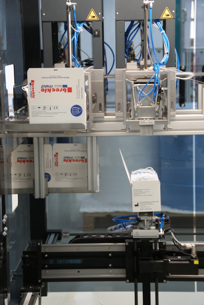 In einer der Hallen des weitläufigen Breckle-Geländes ist die neue Maskenproduktion aufgebaut: Im Sekundentakt stellen hier vier Maschinen OP- und FFP2-Masken her. Sie werden seit Herbst 2020 ergänzt durch ein Qualitätssicherungssystem sowie zwei vollautomatische Verpackungsanlagen. Die Verpackungsanlagen hat Breckle vom Anlagenbauer Ximaj aus dem hessischen Weitefeld bezogen, der sie auf Basis des Igus-Portalsystems Drylin entwickelt und aufgebaut hat.