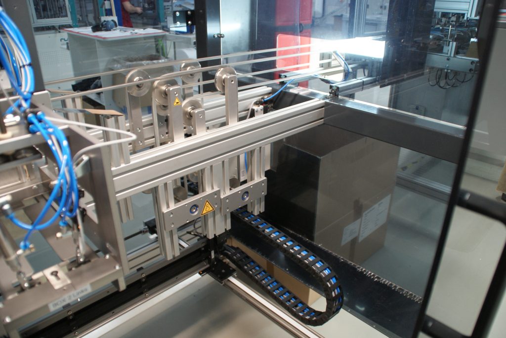 Der Kunststoffspezialist Igus bietet das Raumportal als Low-Cost-Automation-Lösung an, das kleinen und mittelständischen Firmen hilft, manuelle monotone und oftmals fehleranfällige Arbeitsschritte zu automatisieren – in diesem Fall das Verpacken von Masken in Schachteln. Angetrieben von einem flachen Zahnriemenantrieb verfahren die Drylin-Portale absolut schmiermittelfrei und erfüllen dadurch hohe hygienische Standards. Als Komplettsysteme werden die kartesischen Roboter mit Motoren, Zahnriemen, Zahnstangenachsen, Kupplungen und weiterem Zubehör angeboten. Low Cost Automation nennt Igus die Lösung deshalb, weil sie sich auf Grund des günstigen Preises innerhalb eines kurzen Zeitraums – spätestens nach einem Jahr – amortisiert.