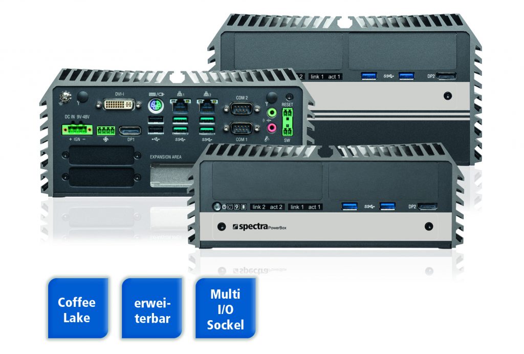 Die Mini-PCs der PowerBox-3000-Serie von Spectra werden ohne Lüfter betrieben. Durch den Einsatz von Coffee-Lake-Prozessoren in Verbindung mit dem Intel-Q370-Chipsatz sollen Daten schneller verarbeitet werden. Eine LED zeigt dauerhaft an, ob die Innentemperatur des Systems im zulässigen Betriebstemperaturbereich liegt. Je nach Modell befinden sich bis zu zwei PCI/PCIe-Einsteckkarten und drei Mini-PCIe-Module im Gehäuse. Optionale Erweiterungen mit 4xGbE oder 4xPoE sind per Plug&Play möglich. Insgesamt können bis zu 20 LAN-Anschlüsse realisiert werden. Der Box-PC passt sich unkompliziert an individuelle Anwendungen an und verfügt über zusätzliche Schnittstellenausbrüche.