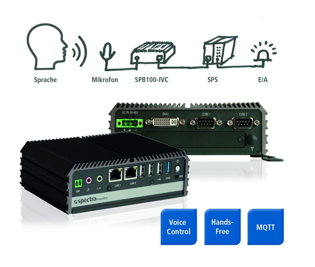 Spectra bietet ein Paket an, das den Einstieg in die Welt der Sprachbedienung erleichtern soll. Darin enthalten ist der kompakte Industrie-PC PowerBox 100-IVC, ein kabelloses Headset und eine Lizenz für das webbasierte Konfigurations-Tool vicSDC. Auf dem IPC ist ein Menü hinterlegt, das durch die einzelnen Konfigurationsschritte führt. Nach dem Download der Sprachbibliothek arbeitet die Sprachbedienung offline als Embedded-Lösung. Für die Kommunikation zwischen der Spracheingabe und einer Steuerung wird der interne MQTT-Broker auf der PowerBox verwendet. Dort werden die im JSON-Format vorliegenden Sprachbefehle ‚veröffentlicht‘ und dann von einer MQTT-fähigen Steuerung ‚abonniert‘ und weiterverarbeitet.