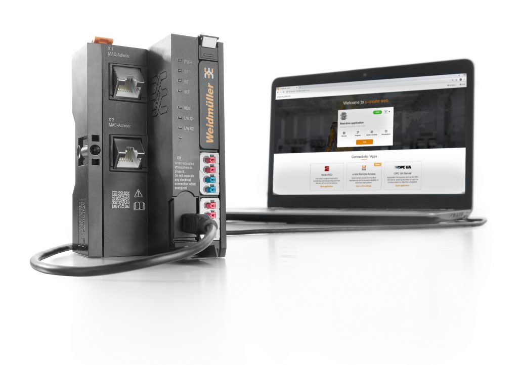 Die flexible Automatisierungslösung wurde von Weidmüller auf Basis plattformunabhängiger Web-Technologien für den Einsatz im Maschinen- und Anlagenbau entwickelt. Die Steuerung eignet sich für kleinere und mittlere Applikationen und gehört zum Automatisierungsportfolio. Der Einsatzbereich erstreckt sich von kleineren und mittleren Standalone-Maschinen bis hin zu großen Anlagen, wo sie als dezentrale Steuereinheit dient. Bei U-Control Web ist – wie der Name schon verrät – der Webserver bereits installiert, inklusive der Software U-Create Web, die folgende Softwaremodule integriert: die Entwicklungsumgebung für die Automatisierung, eine Entwicklungssoftware Node Red, die Visualisierungssoftware und einen OPC-UA-Server. Mit der jetzt neu integrierten Container-Technologie erhält der Anwender zusätzlich ein offenes System, um eigene Software oder auch 3rd-Party-Software auf der Steuerung auszuführen.