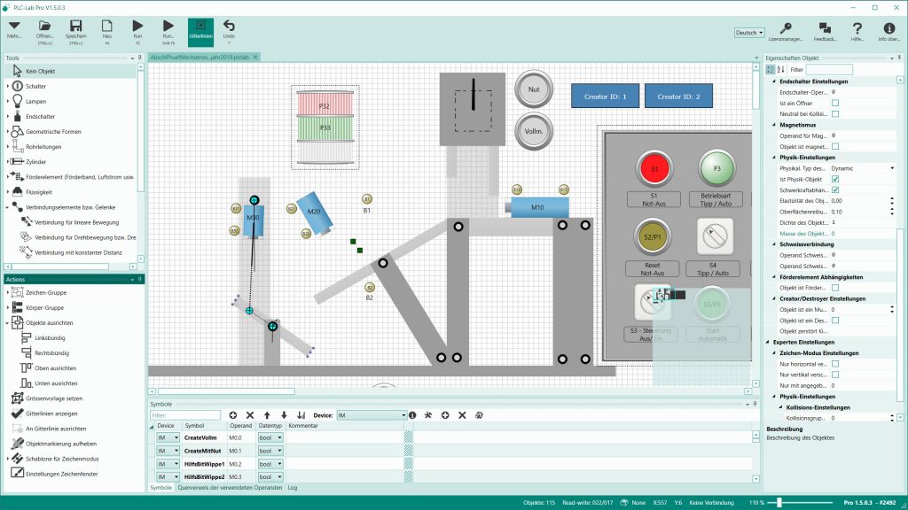 Mit der Software PLC-Lab kann ein vereinfachter digitaler Zwilling in 2D erstellt und für den Test von SPS-Programmen verwendet werden. Dafür stehen Elemente, wie Schalter, Lampen, Endschalter, Geometrische Formen sowie Rohrleitungen und weitere zur Verfügung. Sie verfügen über physikalische Eigenschaften wie Schwerkraftabhängigkeit und Oberflächenreibung. Mithilfe von Verbindungselementen können die Objekte miteinander gekoppelt und dynamisiert werden. Das gesamte Userinterface inklusive der virtuellen Anlage der Software wird durch eine Vektorgrafik dargestellt. Außerdem ist das Vergrößern und Verkleinern ohne Qualitätsverluste möglich und eine virtuelle Maschine kann mit einer realen Steuerung oder Software-SPS gekoppelt werden. Beim Datenaustausch werden die Sensordaten in die Steuerung geschrieben und Ausgangssignale können nach dem Auslesen den Objekten zugewiesen werden.