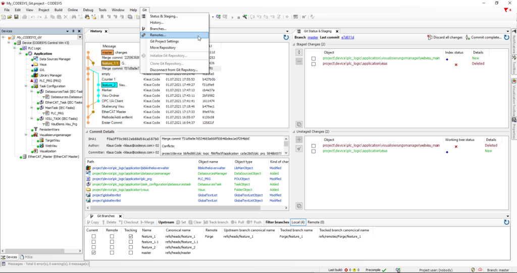 Zur Quellcodeverwaltung wurde bislang Apache Subversion unterstützt. Nun ergänzt ein integrierter Client für die beliebte Open-Source-Versionsverwaltung Git das Tool. Der Quellcode von Steuerungsapplikationen kann so in verteilten Datenbanken verwaltet werden, den Repositories. Werden im Entwicklungsprozess Änderungen am Quellcode vorgenommen, protokolliert das System diese automatisch. Bei Bedarf lassen sich ältere Stände der Applikation problemlos wiederherstellen. Wird ein Projekt aufgrund der Größe, Komplexität oder des Zeitdrucks mit mehreren Applikationsentwicklern gleichzeitig umgesetzt, dann lassen sich sie Aufgaben mit einem Tool wie Git sicher koordinieren. Dabei nutzen Anwender die Versionsverwaltung in einem logischen Workflow, der sich kaum von der Arbeit ohne Git-Anbindung unterscheidet.