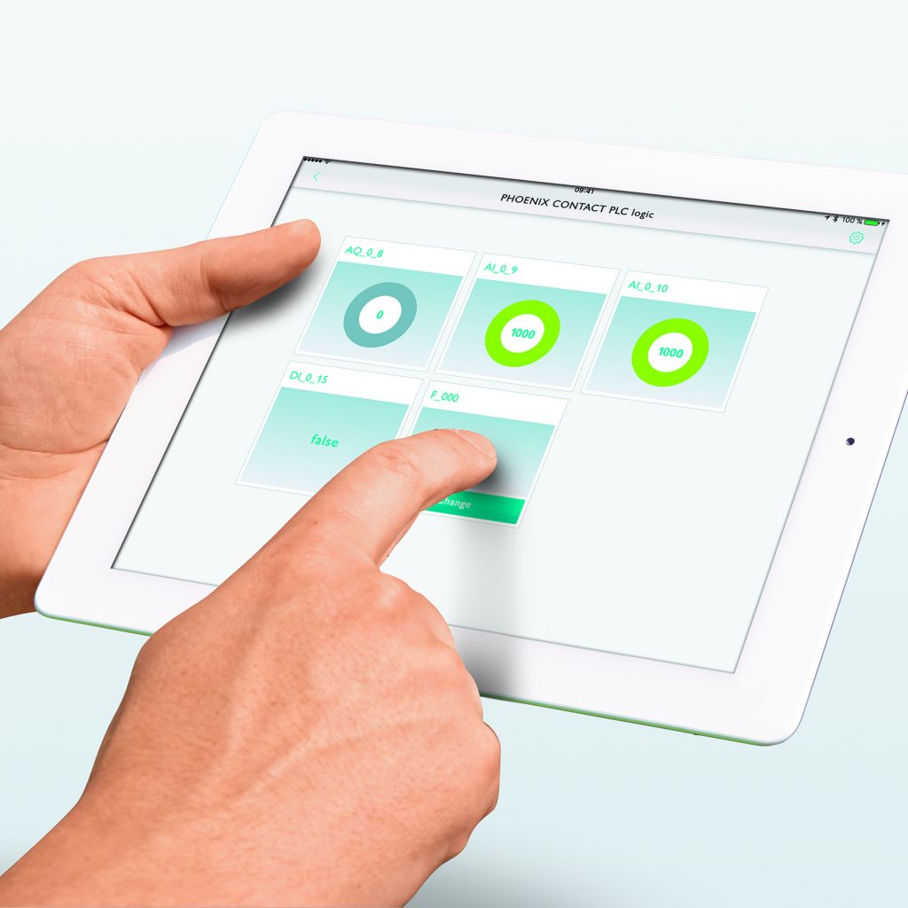 Die PLC logic App ermöglicht den drahtlosen Zugang zu den Prozessdaten des Logikmoduls über ein mobiles Endgerät, das beispielsweise ein Tablet oder Smartphone sein kann. In Kombination mit dem Bluetooth Adapter, der einfach auf die Logikmodule gesteckt wird, steht somit ein mobiles HMI zum Bedienen und Beobachten zur Verfügung. Neben der Anzeige von Status und Werten der digitalen und analogen Ein-/Ausgänge kann der Anwender mit der App bidirektional auf Programmvariablen wie Merker sowie numerische und Zeitwerte zugreifen. Mit der App lassen sich zum Beispiel Sollwerte oder Ein-/Ausschaltverzögerungen einfach ändern, ohne das eigentliche Logikprogramm öffnen zu müssen. Die Auswahl der Prozessdaten und die Erstellung der Visualisierungsansicht wird mit dem Editor des in die Logikmodule integrierten Webservers umgesetzt. Ein PIN-Schutz verhindert den Zugang zu einzelnen Seiten der App.