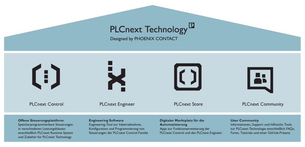 Bei PLCnext Technology handelt es sich um ein offenes Ecosystem für aktuelle und zukünftige Automatisierungsanforderungen. Dabei erlaubt die Technologie die Kombination von Automatisierungsaufgaben und IoT-Ansprüchen in einem Gerät. Abgesehen von der Steuerungs-Hardware umfasst das Ecosystem die modulare Software-Plattform PLCnext Engineer, den digitalen Marktplatz PLCnext Store, die informative PLCnext Community sowie die Option einer systemischen Cloud-Integration. Die innovative Firmware-Architektur setzt auf einer Linux-Plattform auf und ermöglicht dem Anwender sowohl die Nutzung von IEC61131-Code ebenso wie zahlreichen Hochsprachen – etwa C, C++, Python oder C# – und Regelalgorithmus-Modellen in Matlab Simulink. Ein Steuerungsprogramm kann hier aus lediglich einer oder einem beliebigen Zusammenspiel der aufgelisteten Programmiersprachen bestehen. Die Anwender können also in der von ihnen präferierten Umgebung arbeiten, was die Codeerstellung deutlich beschleunigt.