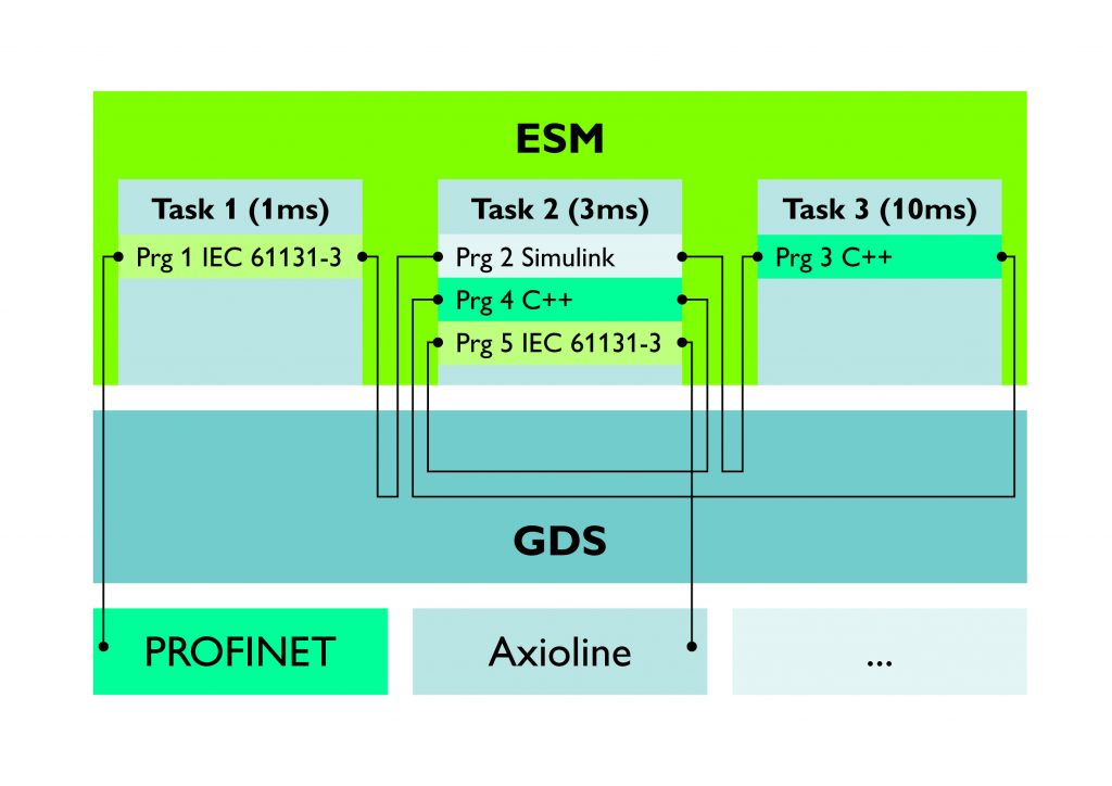 Neben der beschriebenen Kombination lassen sich Linux-Programme ohne die Verwendung der PLCnext Runtime direkt durch das Betriebssystem verwalten. Die freilaufende, durch Events gesteuerte Linux-Anwendung kann ebenfalls auf die Prozessdaten der in Echtzeit ausgeführten Programme zugreifen. Damit stellt die PLCnext Technology ein hohes Maß an Flexibilität in den Bereichen zur Verfügung, wo jede andere Systemarchitektur an ihre Grenzen stößt. Als besonders komfortabel erweist sich, dass Hochsprachenprogramme nicht mehr in eine IEC61131-Task eingebunden werden müssen. Der Execution and Synchronisation Manager (ESM) der PLCnext Runtime sorgt durch ein patentiertes Task Handling dafür, dass Hochsprachen-Code, Matlab Simulink-Modelle und IEC61131-Applikationen in einer definierten und zeitlich deterministischen Reihenfolge ausgeführt werden. Für jeden Kern des Prozessors Intel Atom E3930 Dual Core mit einer Taktfrequenz von 1,3GHz steht ein separater ESM bereit. So lassen sich die Programme vom Anwender bewusst auf die beiden CPU-Kerne aufteilen, um Aufgaben zu entkoppeln oder Performance-Reserven für einzelne Programme sicherzustellen.