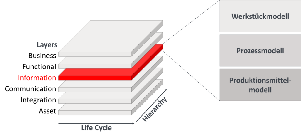 Bei der Entwicklung des Referenzmodells liegt der Fokus auf der Digitalisierung bestehender und zukünftiger Zuliefernetzwerke in der Fahrzeug- und Zuliefererindustrie. Hierfür werden bestehende Standards und offene Datenmodelle aus den Bereichen der Produktionsmittel und -systeme, des Life Cycle Managements, der Produkt- und Qualitätsmodelle sowie der Produktionsprozesse analysiert. Übergeordnetes Ziel des Arbeitspaketes ist es durch die geeignete Komposition etablierter und Abstraktion konkurrierender Modelle eine konsistente Abbildung mit Referenzcharakter über die gesamte Lieferkette hinweg zu ermöglichen. Die Abbildung im Referenzmodell gliedert sich in unterschiedliche Teilmodelle oder Verwaltungsschalen, um die jeweiligen Perspektiven von Werkstücken, Prozessen oder Produktionsmitteln einzunehmen. Das gesamte Modell, mit all seinen Perspektiven, befinden sich in der dreidimensionalen Darstellung des Referenzarchitekturmodells Industrie 4.0 (RAMI 4.0) nach DIN/SPEC91345 auf dem Information Layer und bilden diese Ebene in Ihrer Gesamtheit für die darzustellenden Anwendungsfälle im Zuliefernetzwerk voll aus.