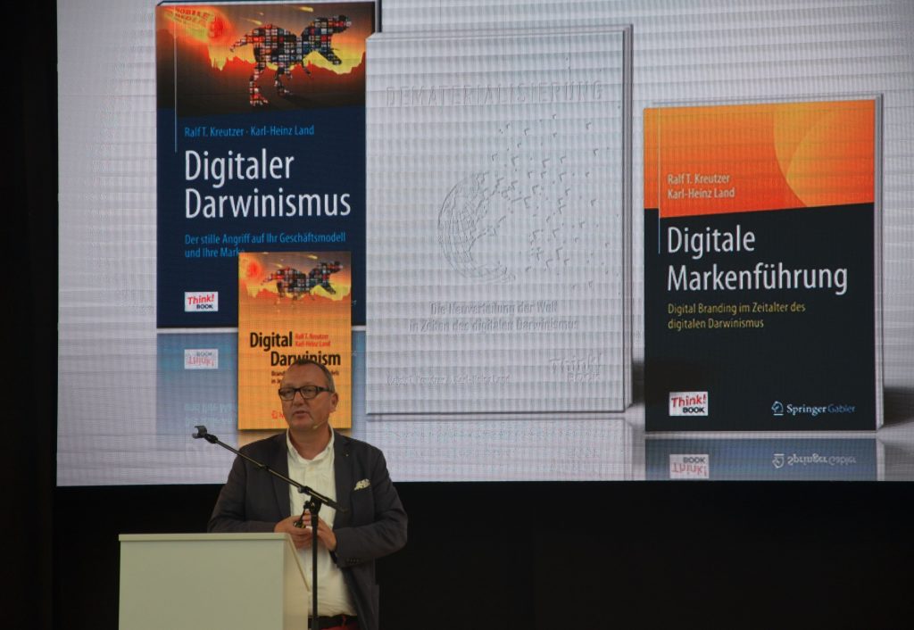 Die gesamtgesellschaftliche Dimension dieser Entwicklung umriss zunächst Karl-Heinz Land, Gründer und Geschäftsführer der Kölner Strategieberatung Neuland, in seinem Vortrag ‚Dematerialisierung – Die Neuverteilung der Welt in Zeiten des digitalen Darwinismus‘. Land schilderte dabei die Transformation der Wertschöpfungskette von physisch vorhandenen Dingen wie Autos, Geld oder Maschinen hin zu Software, Plattformen und Dienstleistungen. „Bereits heute befinden sich unter den Top 10 der weltweit erfolgreichsten börsennotierten Unternehmen sechs Softwarefirmen. Das heißt die Neuverteilung findet bereits statt“, gab Land zu bedenken. Digitalisierung, Vernetzung und Automatisierung seien in vollem Gange und würden künftig Gesellschaft und Wirtschaft gleichermaßen prägen. Unternehmen, die auch künftig erfolgreich sein möchten, benötigen eine digitale Vision, so Lands These: „Wenn ich heute Verantwortung für ein Unternehmen trage, das Autoschlüssel herstellt, aber weiß, dass morgen diese Autoschlüssel durch eine App ersetzt werden, muss ich mich umgehend fragen, wie ich meine Firma künftig ausrichten will. Brauche ich wirklich noch Arbeitskräfte zum Drehen, Fräsen oder Spritzgießen, oder sollte ich mich nicht eher nach Webentwicklern oder Security-Spezialisten umsehen?“ Digitaler Darwinismus entstehe dann, wenn sich Gesellschaft und Technologien schneller veränderten, als Unternehmen und Organisationen sich anpassten.
