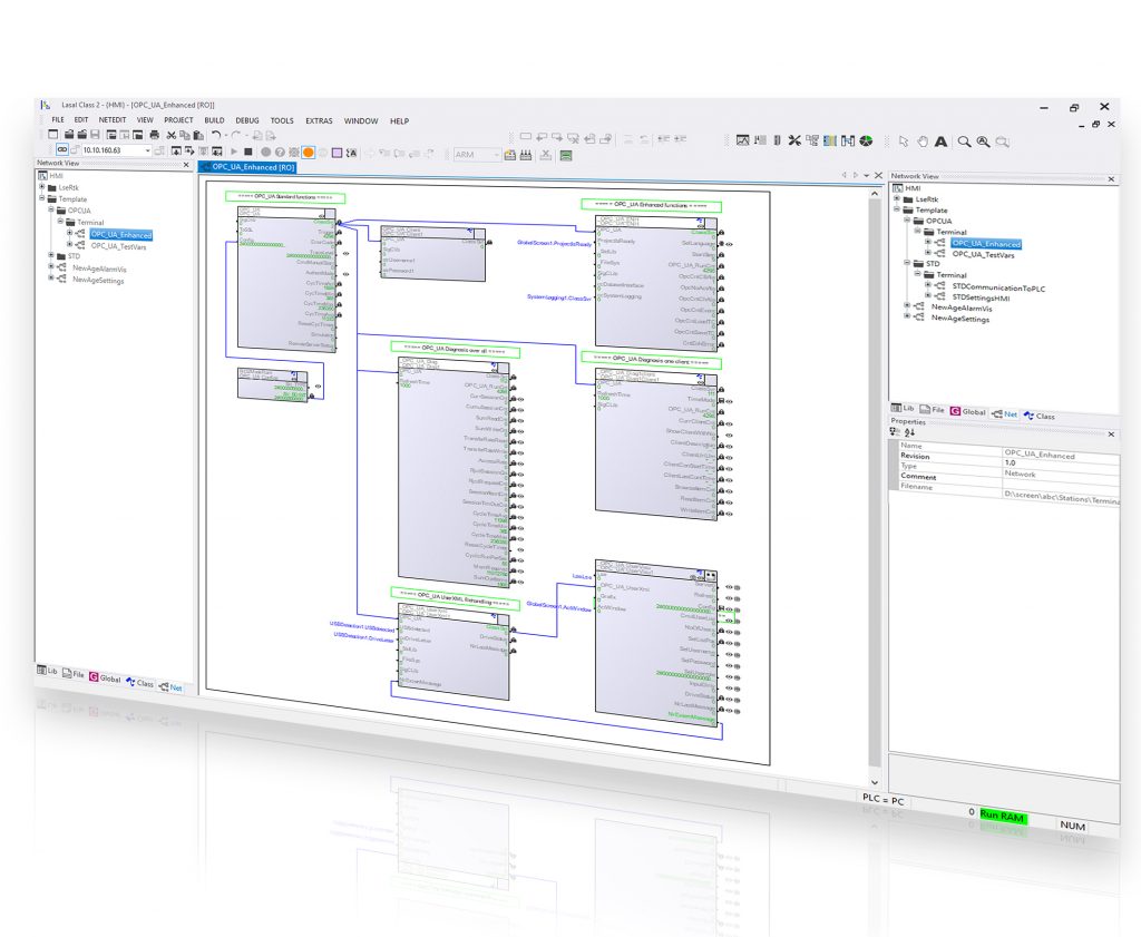 Lasal ist auch für agile Entwicklungsteams geeignet, da die Arbeit sehr strukturiert erfolgen muss. „Bei unsauber implementierten Programmen und Variablen, die kreuz und quer im Projekt verteilt beschrieben werden, sind Auswirkungen einer Programmänderung praktisch nicht vorhersehbar“, betont Aschl. Ganz anders bei der OOP: Die Objekte werden nach außen hin gekapselt, sodass eine ungewollte Beeinflussung nahezu ausgeschlossen werden kann. „Variablen sind nur über zugehörige Methoden manipulierbar. Somit sind klare Schnittstellen vorgegeben, die es dann auch zu verwenden gilt“, so Aschl weiter. „Die visuelle Darstellung der gekapselten Objekte im Netzwerk mit allen Kommunikations-Schnittstellen ist bei Lasal einzigartig und sorgt für hohe Transparenz genauso wie das Low-Code-Prinzip.“ „Durch die grafische Darstellung von Objekten wird der Texteditor anders als bei anderen objektorientierten Tools wirklich erst am Schluss eingesetzt“, erklärt Aschl. Die Implementierung der Methoden in der Klasse kann der Softwareingenieur in Programmiersprachen wie ST, AWL oder KOP nach IEC61131-3 oder in C vornehmen. Moderne Engineering Tools wie Lasal machen die Nutzung der objektorientierten Programmierung einfach, indem sie immer wiederkehrende Funktionen übernehmen. Z.B. wird der Code für die Deklarationen von Klassen, Variablen oder Schnittstellen automatisch im Hintergrund erstellt. „Variablen können nicht nur visualisiert, sondern über globale WAN-Netzwerke firmenübergreifend zur Verfügung gestellt werden, sodass auch gleich bei der Entwicklung festgelegt wird, welche Schnittstellen von außen bedienbar bzw. sichtbar sind“, sagt Aschl.