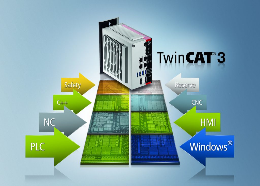 Über Jahrzehnte hinweg war die Weiterentwicklung der Prozessortechnik durch steigende Taktfrequenzen geprägt. Allerdings stößt diese Entwicklung zunehmend an ihre physikalischen Grenzen, sodass in einem Chip anstatt eines Prozessorkerns mit gesteigerter Taktrate nun eine wachsende Anzahl parallel arbeitender Prozessorkerne implementiert wird – die sogenannte Multicore-Technologie. Diese hat Beckhoff ebenfalls schon sehr früh in unterschiedlichen Industrie-PC-Reihen umgesetzt, bis hin zu den hochleistungsfähigen Many-Core-Ausführungen mit Intel-Xeon-Prozessoren. Dazu zählen der 2014 vorgestellte Industrieserver C6670, aktuell mit bis zu 40 Prozessorkernen, und die Embedded-PC-Reihe CX2000 aus dem Jahr 2016, die bis zu zwölf Kerne auf der Hutschiene bietet. Um diese parallel zur Verfügung stehenden Kerne auch effizient nutzen zu können, darf man sich bei der Integration des entsprechenden Chipsatzes jedoch nicht nur auf die notwendigen Hardwareanpassungen beschränken. Vielmehr liegt das hauptsächliche Nutzenpotenzial in einer optimal auf die Multicore-Technologie angepassten Software. So profitieren Anwender der Automatisierungssoftware Twincat 3 von einem durchgängigen und seit vielen Jahren nutzbaren Multicore-Support.