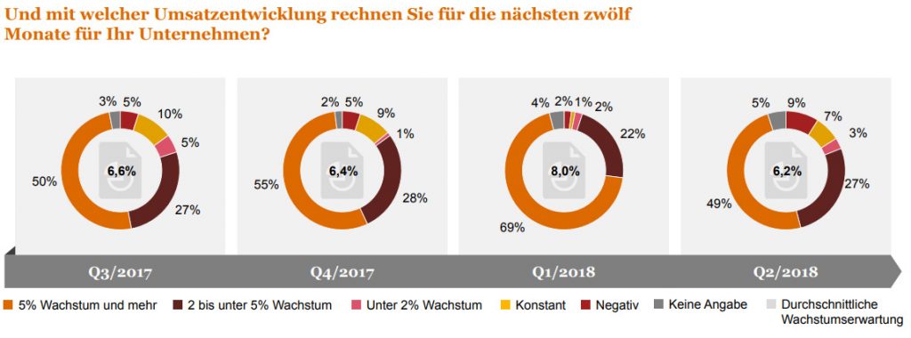 Diese Unsicherheit spiegelt sich in deutlich nach unten angepassten Umsatzerwartungen wider: Für die Gesamtbranche prognostizieren die befragten Manager ein Wachstum von 3,8 Prozent in 2018 (Vorquartal: 4,8 Prozent), für das eigene Unternehmen 6,2 Prozent (Vorquartal: acht Prozent). Gleichzeitig sprechen die im Rahmen der Umfrage erhobenen Erwartungen zur Markt- und Unternehmensentwicklung weiterhin eine überwiegend positive Sprache: Lediglich acht Prozent der Befragten rechnen mit kurzfristig sinkenden Gewinnmargen, nur drei Prozent mit sinkenden Preisen. Insgesamt liegt die derzeitige Auslastungsquote bei über 93 Prozent – rund zwei Drittel der Unternehmen arbeiten am Kapazitätslimit.