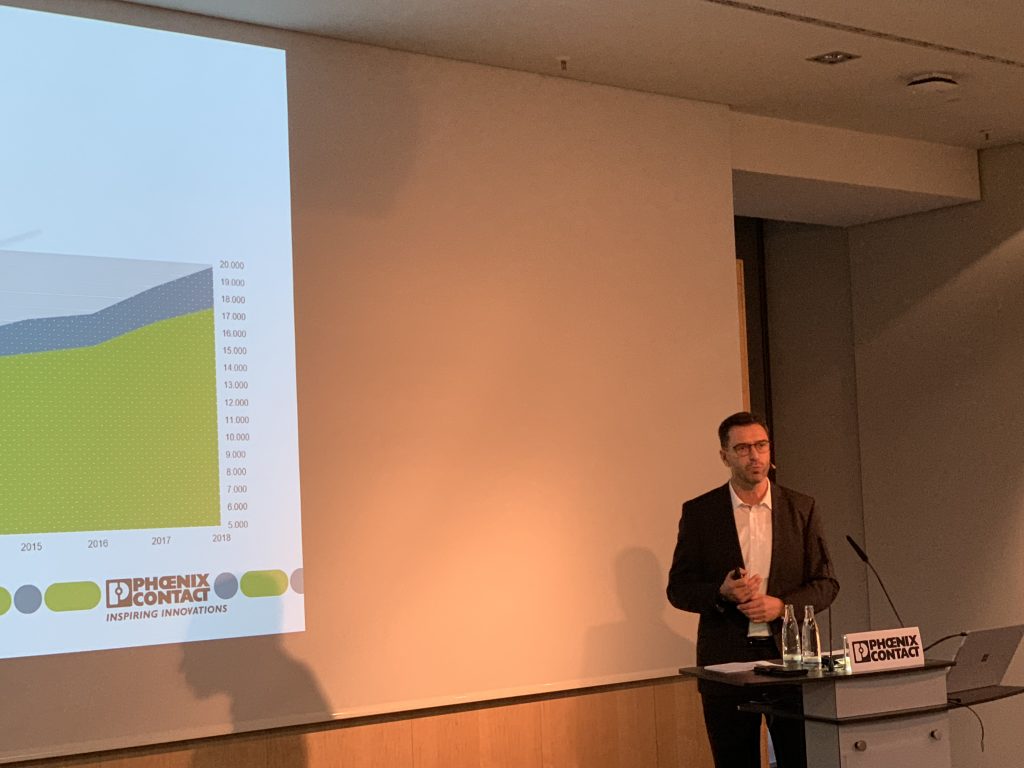Die Geschäftslage bei Phoenix Contact hat sich insgesamt – nach 11,5% Wachstum in 2017 – wiederholt sehr positiv entwickelt. Nachdem in 2017 die 2Mrd.€-Umsatzmarke überschritten wurde, wird der Umsatz in 2018 bei über 2,3Mrd.€ liegen. Das Wachstum in den Märkten war damit wieder deutlich zweistellig, in Euro umgerechnet ergibt sich durch die zum Teil deutlichen Währungsverluste ein Wachstum von etwas über 8%. Der chinesische Markt hat sich weiter erholt und wächst wie in 2017 erneut zweistellig. In den USA ist das Wachstum mit über 15% noch etwas besser, liegt damit aber noch knapp unter den Wachstumsergenissen von Europa, wo – außerhalb von Deutschland – 16% erreicht werden. Deutschland ist mit über 25% Anteil am weltweiten Umsatz immer noch der bedeutendste Markt für das Unternehmen. Investiert hat das Unternehmen 2018 über 200Mio.€. Die Aufwendungen für F&E liegen wie in den vergangenen Jahren bei rund 7% des weltweiten Umsatzes. Die Mitarbeiterzahl wird 2018 um rund 1.400 auf knapp 17.500 ansteigen. In Deutschland gibt es – ohne Akquisitionen – einen Personalaufbau von über 500 Mitarbeitern. Für das nächste Jahr rechnet das Unternehmen mit einem Umsatzwachstum im oberen einstelligen Bereich auf knapp 2,5Mrd.€.
