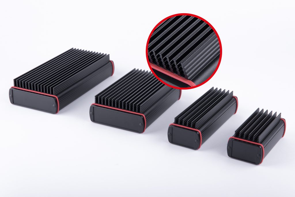 Die Elektronikgehäuse der Alubos-Reihe sind universell einsetzbare, schwarz beschichtete Aluminiumprofilgehäuse mit ergonomisch gestalteten Seitenflächen und Designdichtungen, die serienmäßig die Schutzart IP65 garantieren. Sie sind in den drei Profilvarianten geschlossen, horizontal geteilt und einseitig offen sowie in neun Profilquerschnitten erhältlich. Zusätzlich sind die drei Profilquerschnitte ABPH 600, ABPH 1000 und ABPH 1600 auch mit Kühlrippen lieferbar. Leistungselektronik erzeugt Wärme, die abgeführt werden muss, um die Gerätefunktion dauerhaft zu erhalten. Bei den horizontal geteilten Profilgehäusen wird das herkömmliche Profilunterteil um ein Kühlkörperprofil ergänzt, das für eine ausreichende Kühlleistung sorgen soll.