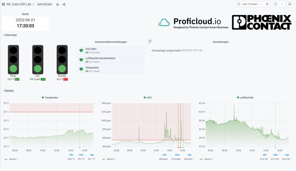 Die Datenweiterleitung erfolgt durchgängig auf der Grundlage von Ethernet, weshalb sich der Sensor direkt mit der Steuerung oder bis in die Cloud austauschen kann. Dazu greift der Anwender auf etablierte Ethernet-basierte Kommunikationsstandards wie MQTT oder Modbus TCP zurück. Auf diese Weise lassen sich schlanke Systemlösungen konzipieren, die aus Sensorik sowie Automations-/Steuerungstechnik bestehen. Der Jumo-Sensor HydroTrans misst die Raumtemperatur, Luftfeuchte sowie die CO2-Konzentration und schreibt die Werte anschließend über die SPE-Schnittstelle via MQTT-Protokoll direkt in eine Cloudapplikation.