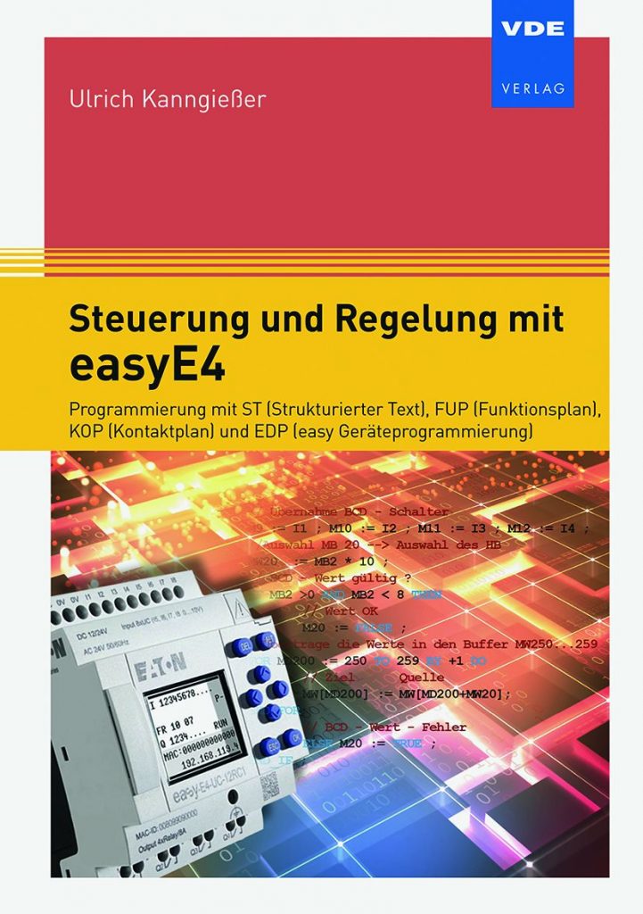 Mit dem Steuerrelais EasyE4 kann die Steuerung und Regelung unterschiedlicher Anwendungen in der Industrie und im Gebäudebereich effizient, flexibel und einfach umgesetzt werden. Das neue EasyE4-Sortiment ist wesentlich kompakter aufgebaut als die Vorgängerreihen Easy500, Easy700 und Easy800 und bietet eine große Spannungsvielfalt. Zusätzliche Flexibilität ermöglichen die vier verfügbaren Programmiersprachen Funktionsplan (FUP), Strukturierter Text (ST), Kontaktplan (KOP) und Easy-Geräteprogramm. Das Buch beschreibt das Anwendungsspektrum der neuen Kleinsteuerung anhand zahlreicher Praxisbeispiele. Demonstriert wird z.B. die moderne Programmierung im Kontaktplan sowie im Funktionsplan. Ein weiteres Thema ist die Modularisierung der Anwendersoftware, die Vernetzung, die Einbindung über die Ethernet-Schnittstelle in IIoT-Architekturen bzw. Industrie 4.0, Aspekte der Visualisierung und das Datenlogging per Speicherkarte.