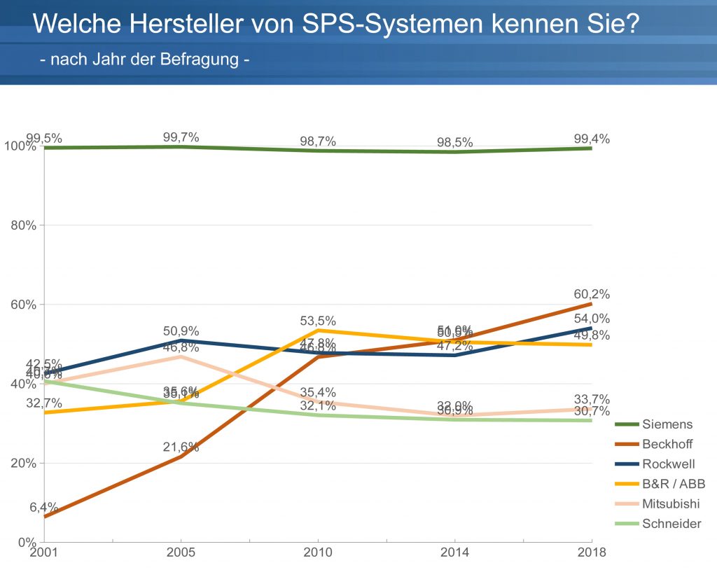 Der Markt für SPS-Systeme wird in Deutschland nach wie vor von Siemens dominiert. Das Unternehmen hat ihre herausragende Stellung im Markt sowohl beim Bekanntheitsgrad als auch beim Kauf in den letzten Jahren weitgehend gehalten. Am stärksten entwickelt hat sich in den vergangenen Jahren Beckhoff. 2001 mit sechs Prozent noch weitgehend unbekannt, steht der Konzern heute mit 60 Prozent an zweiter Stelle des Bekanntheitsgrades, was sich auch auf eine hohe Steigerung an Kunden ausgewirkt hat. Diese Entwicklung zeige, dass auch kleinere Unternehmen (im Vergleich zu internationalen Konzernen) durchaus Chancen haben, in einem bestehenden Markt Erfolge zu feiern. Sie könnten sich dabei vor allem durch die Erfüllung technischer Anforderungen aber auch durch einen guten Preis profilieren.