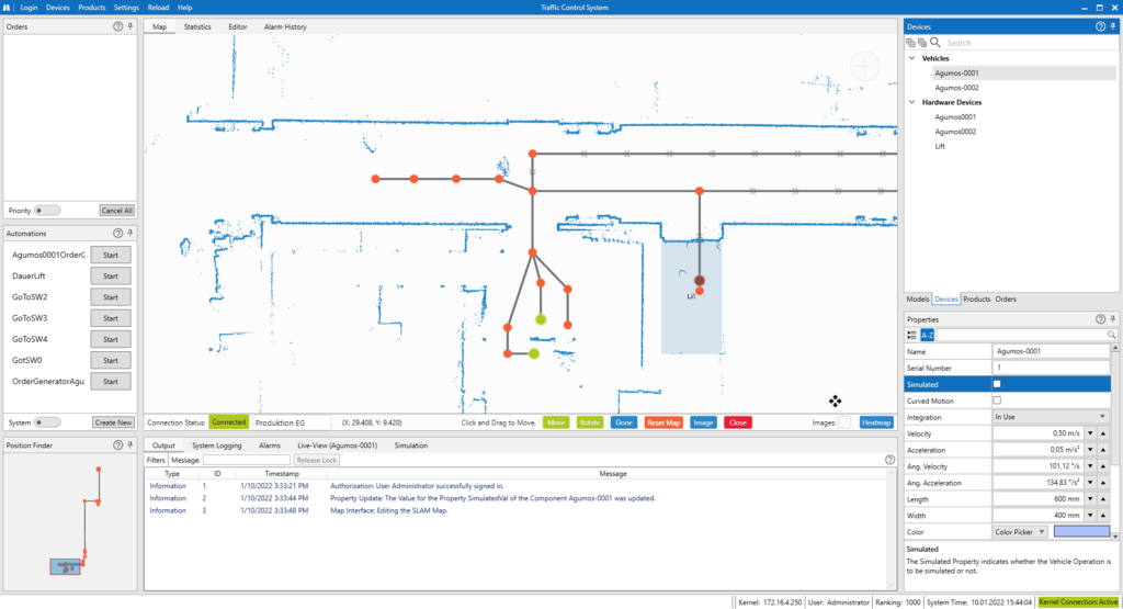 Zur Konfiguration eines FTS-Leitsystems gehört auch die Integration externer Geräte. Einfachere Dinge wie z. B. Ampeln oder Schranken lassen sich schnell und komfortabel hinzufügen und konfigurieren. Für die Integration komplexerer Knotentypen wie Rolltore oder Aufzüge finden sich vorbereitete Schnittstellenroutinen in der Programmbibliothek. Die physikalische Hardwareanbindung für umgebende Steuerungs- oder Automatisierungssysteme sowie ERP- oder Lagerverwaltungssysteme erfolgt per MQTT-Schnittstelle oder über ein REST API.