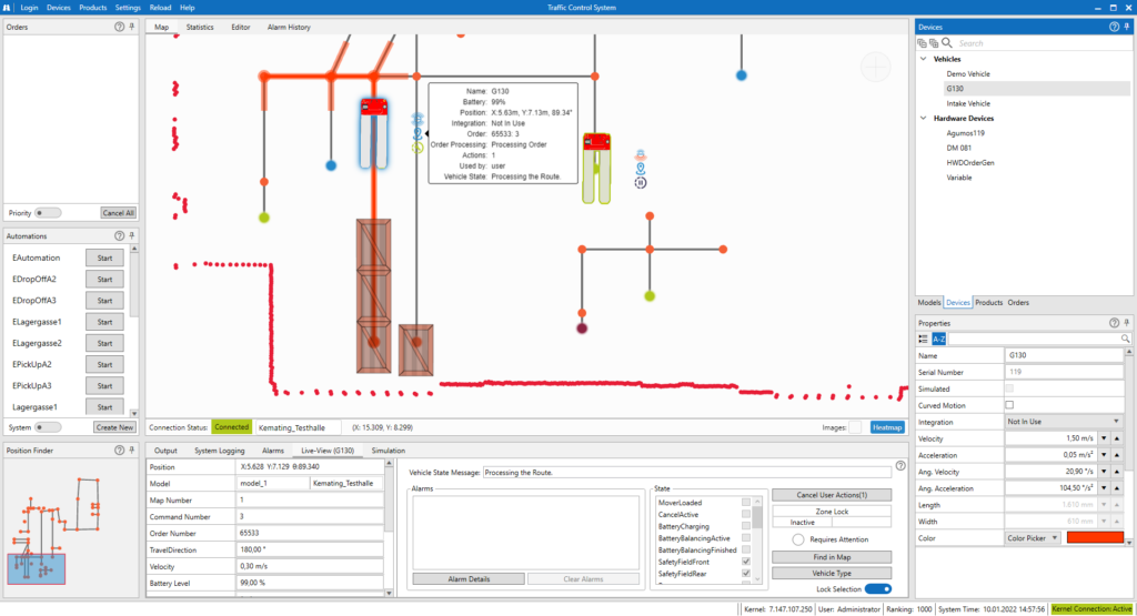 „Das wichtigste Unterscheidungsmerkmal zwischen guten und weniger guten FTS-Leitsystemen ist ihre Fähigkeit zur effizienten und dynamischen Verkehrsplanung“, unterstreicht Sigmatek-Applikationsingenieur Gerhard Veldman, der federführend an der Entwicklung von TCS mitwirkte. „Es geht um eine effiziente Auftragsabarbeitung mit geringster Streckenbelegung.“ Dabei müssen Vorfahrtsregeln (z.B. begehbare Routenstücke oder aufnehmbare Ladungen) und die Ladezustände der Fahrzeug-Akkus beachtet werden. Dynamisch reagieren zu können, ist ein wichtiger Teil der Routenplanung. Wenn z.B. ein Hindernis gemeldet wird, oder die Landkarte angepasst wird, reagiert das TCS sofort und sucht die bestmögliche Route für alle Fahrzeuge unter Berücksichtigung der neuen Bedingungen.