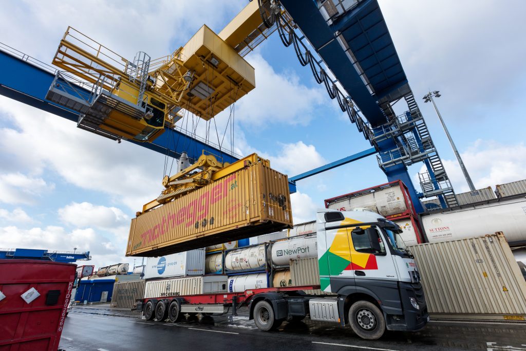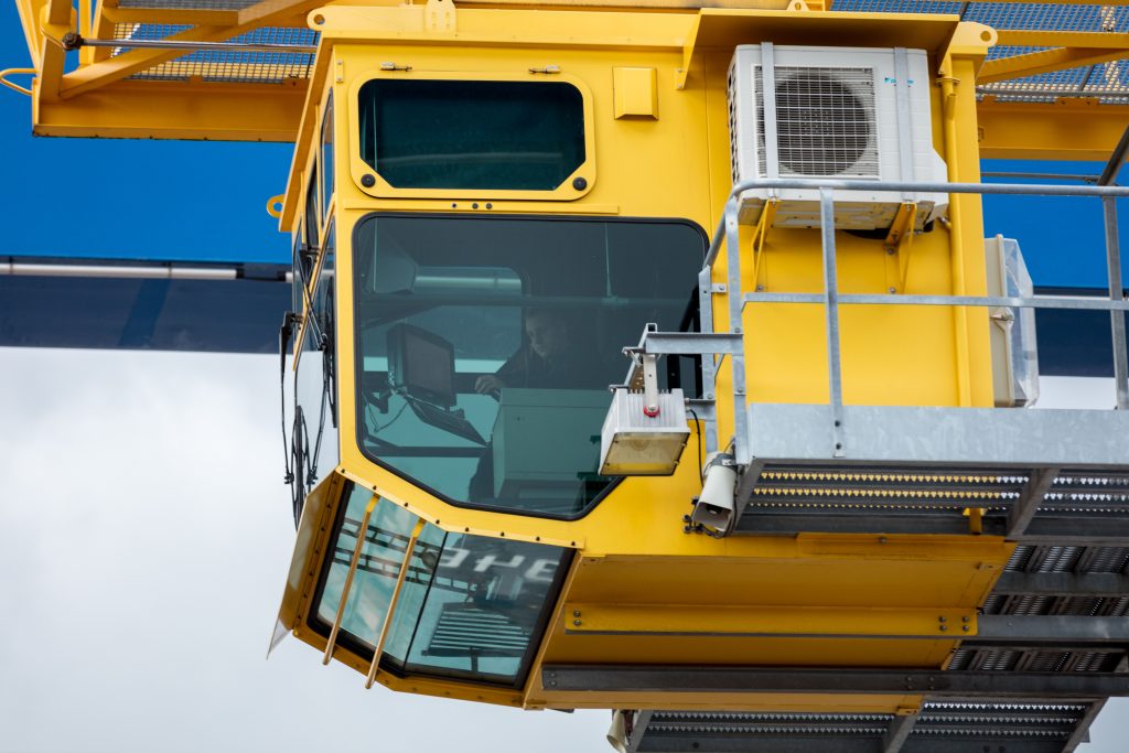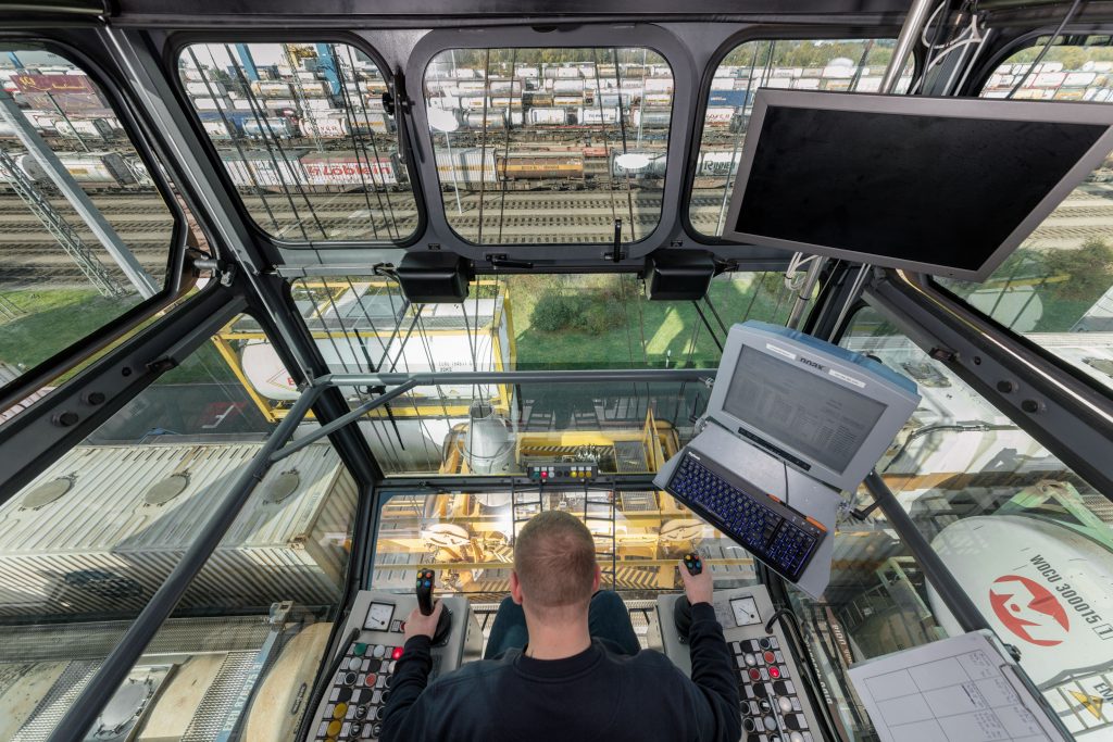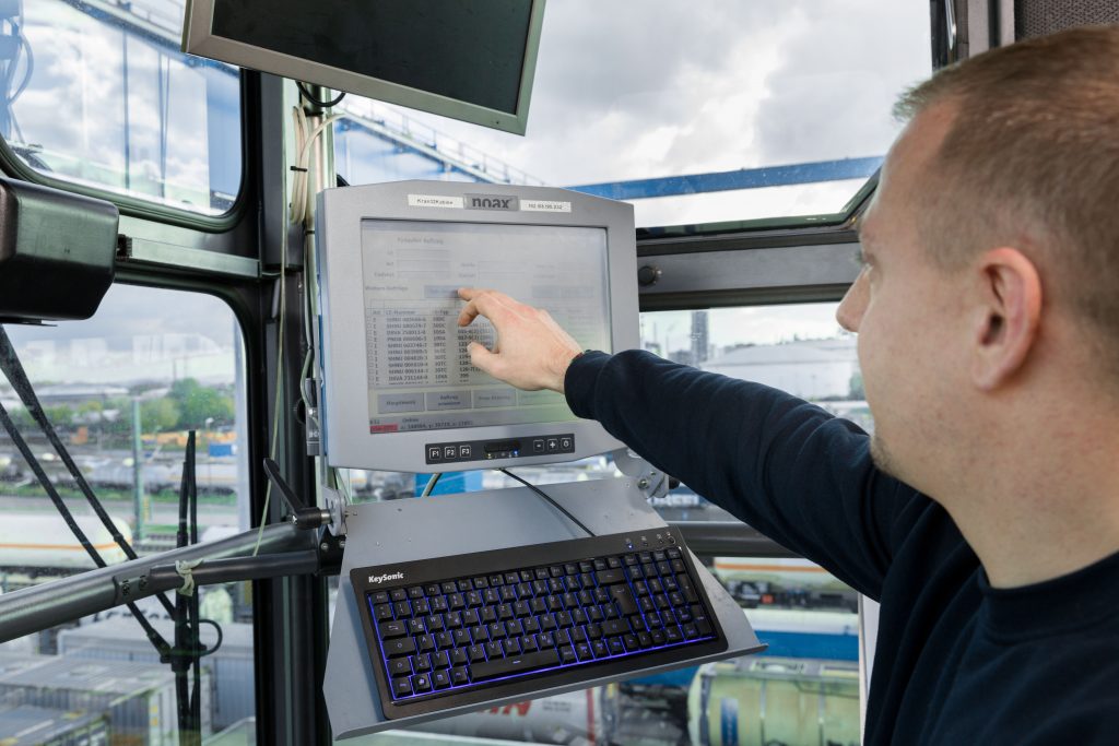 Um die Züge schnell und ökonomisch zu bestücken, sind Portalkrane im Einsatz, um Container von einem Fahrzeug auf ein anderes umzuladen. Die Industrie-PCs befinden sich in den Kabinen direkt vor den Sitzen der Kranführer, sodass diese jederzeit den Bildschirm im Blick haben. Auf den PCs sind ein Terminal Operating System für das korrekte Ausführen der Umschlagaufträge, ein Kranmanagementsystem und die betriebseigene Software installiert. Da sich bestimmte Programme nur über eine Tastatur bedienen lassen, befindet sich diese für das Eingeben von Informationen unterhalb des Touchscreens. Somit können die Kranführer ihre Arbeitsaufträge direkt auf den Monitor erhalten.